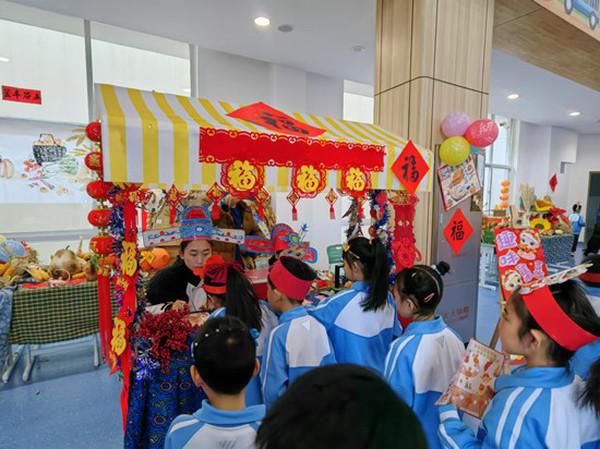 在前三关利用鞭炮、对联、年画、灯笼等赶走年兽后,“蛇舞欢歌迎春来”孩子们对照连环画讲述驱年兽故事,锻炼口语表达和逻辑思维,然后通过打击节奏表达欢快的心情。在后面第二部分的关卡中,学生们开始为迎接新年做准备,“齐购年货盈门喜”模拟集市场景,孩子们依据道法课堂所学礼貌沟通采购糖果并进行分类,通过集福答题换取五福福卡,增强生活实践与人际交往能力。